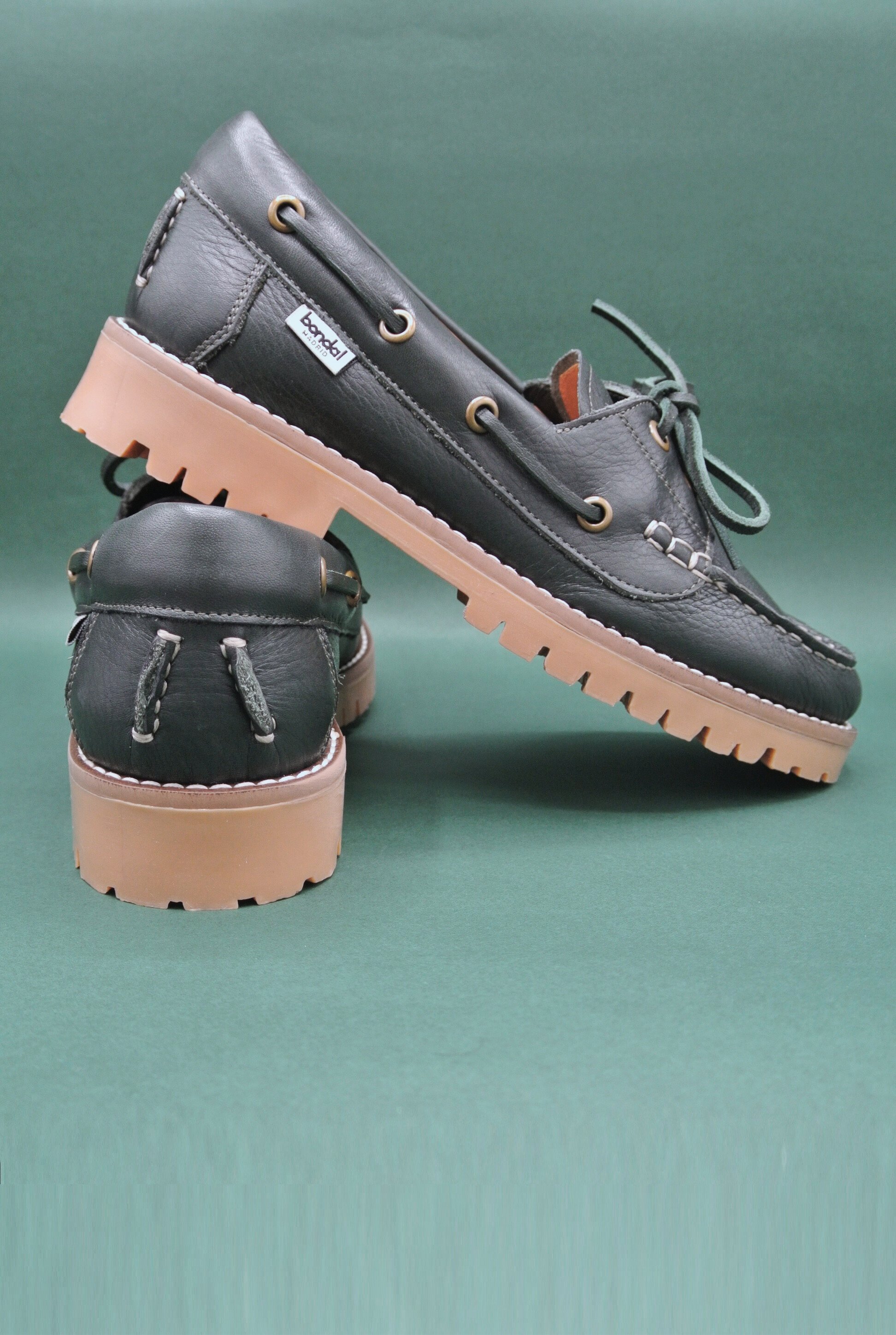 Su diseño incluye nuestro característico logo en forma de torres oblicuas cosidas a mano en la talonera y piso de 2,5cm de altura.